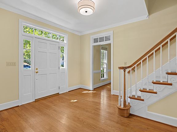 Incredible 4 bedroom, 2.5 bathroom home in the attractive Wildwood Green golf community! Situated at the corner of 2 quiet cul-de-sacs and across from community greenspace, this gorgeous home offers a seamless floor plan, hardwood flooring, crown molding, whole house vacuum system, oversized 2-car garage, spacious walk-up attic for plenty of your storage needs! Main floor boasts formal dining room, living room can be used as an office, den with built-in bookshelves and a brick gas log fireplace, kitchen with breakfast area and tons of natural light! Top floor bedrooms with ceiling fans, including huge primary with walk-in closet, walk-in shower, separate soaking tub and double vanity, plus spacious bonus room. Private screened porch and deck, ideal for entertaining, HOA fees include use of pool, playground, pickleball and tennis. Use of Wildwood Green Golf Club facilities offered with separate fees. Recent maintenance includes: roof replaced 2020, new water heater 2024, new outdoor ceiling fans 2024, new garage door opener 2024, new expansion valve and coil 2nd floor HVAC 2023, 1st and 2nd floor HVAC systems converted to modern refrigerants 2023, new smoke and CO detectors 2023. Location provides easy access to I540, US70 and US50. Minutes from RDU and no city taxes. Move-in Ready!