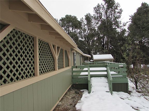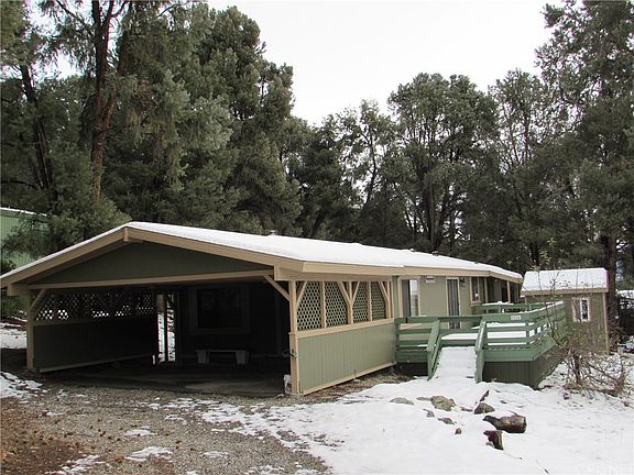 Affordable manufactured home in the mountains and you own the land! This might be the perfect weekend getaway for you or a very comfortable full time living home. You'll appreciate the level driveway leading to a large two space carport and the covered walkway to the front porch on those wonderful snowy days. The interior is roomy with a living room, eating area, breakfast bar, open den or office space, two bedrooms and a full bath at one end and a large master bedroom and full bath with walk-in shower on the other. The laundry room and pantry are conveniently located off the kitchen and French doors lead to the spacious side deck. Off the deck is a well-built finished and lighted workshop or hobby room and a metal shed is out back. HUGE BONUS- the roof and exterior stain are brand new! Nice! Plus the furnishings can be included so all you have to do is pack a bag and come enjoy life in a nearby mountain forest. Come see it soon!