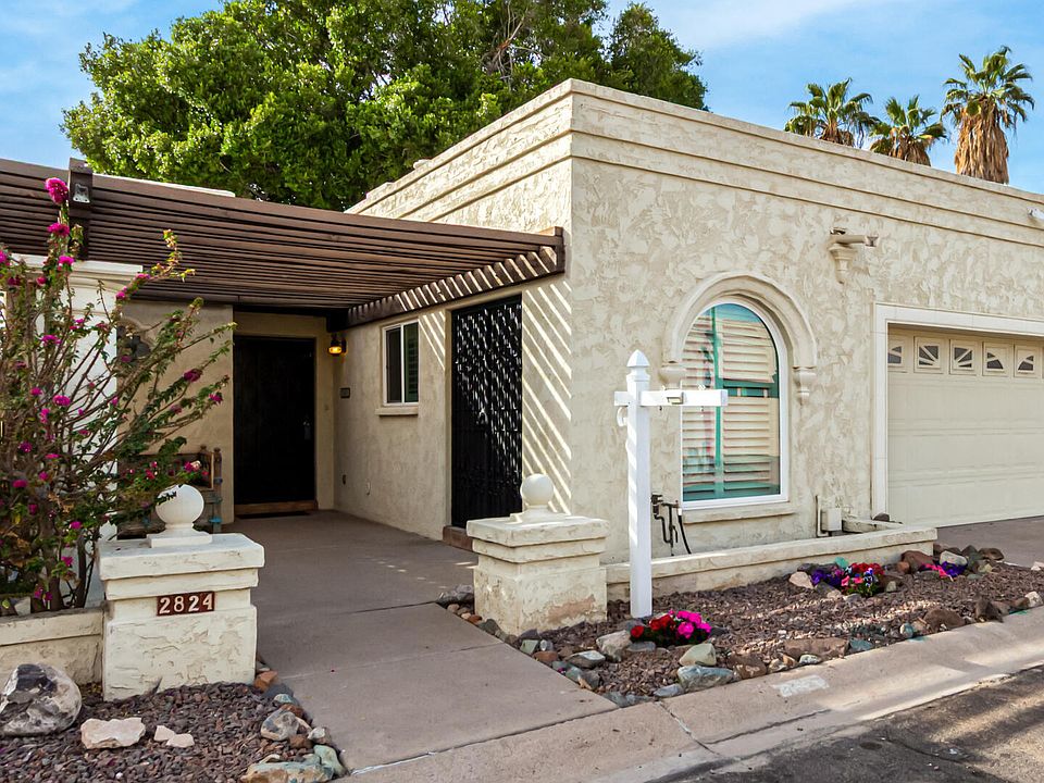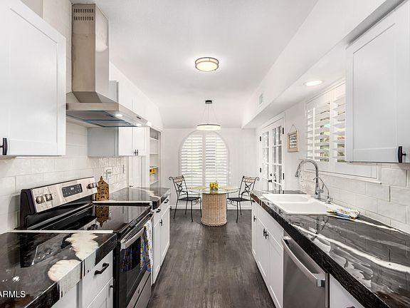 Situated in the stunning surroundings of Arcadia and Scottsdale, Arizona, this 2 bed, 2 bath home seamlessly blends charm and character with modern touches. You'll be captivated by the soaring ceilings with wood beams & skylights, beautiful fireplace, bamboo flooring in all the right places w/recently installed vinyl wood-looking flooring in the kitchen & dining. Eat-in kitchen features white shaker cabinets, sleek countertops, stainless steel appliances and plenty of storage. Bedrooms are spacious with a split floorplan adding privacy. Home has a front covered patio area right off the kitchen with French doors that make the area useful for entertaining. The living room additionally has French doors leading to a large patio area and lush landscaping. This home is cozy and timeless, while designer accents give every room personality and flair. Community pool is just a street over to enjoy. Not to mention the location is near the thriving communities of Arcadia and Scottsdale, you'll have access to top-tier amenities, dining, and entertainment options, along with the charm and convenience of these vibrant neighborhoods. This home doesn't just offer living space; it offers a lifestyle crafted for those who appreciate the best in style, comfort, and location.