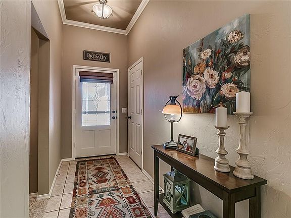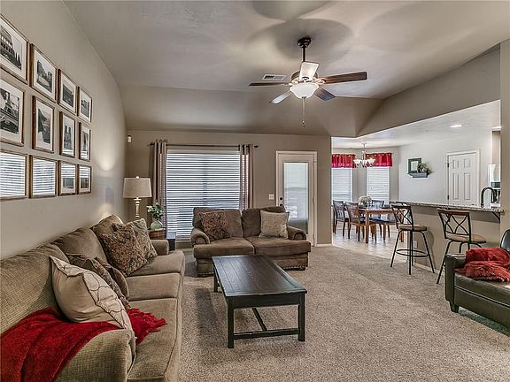 A beautiful, spacious home in North Edmond! Step in the front door and feel right at home with the large, open living room. Walk down the hallway and notice the beautiful shiplap wall in the first room or the cathedral type ceiling in the other. Walk in the master bedroom and take a relaxing splash in the tucked away bath tub or check out the amazing walk-in shower and closet. We were amazed at the unique backsplash and the bar counter in the kitchen and know you will be too. Protect your family with the storm shelter located in the garage! This home offers so many features that you won't want to miss out on! Our favorite feature of this home is the open backyard with it's incredible views.