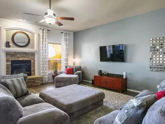 Stunning custom built Stillbrooke home located in the desirable Cabezon community! Home features 2, 710sf with 4 bedrooms, 3.5 bathrooms and a 3 car garage. Private courtyard entry! Home exudes elegance and upgrades throughout. Great living area with a beautiful gas fireplace with natural stone accents. Luxurious kitchen with upgraded cabinetry, granite countertops, custom backsplash, built-in oven/microwave, gas cooktop, range hoof, center prep island, bar with seating space, pantry and a breakfast nook. Separate formal dining area with a plank wall and custom lighting. Master suite with outdoor access and a private bath. Bath hosts dual sinks, an over-sized vanity, jetted tub, walk-in shower and closet! Fully walled backyard with partial mountain views and a large patio! Landscaping and Pest Control included!