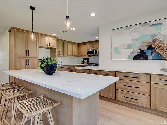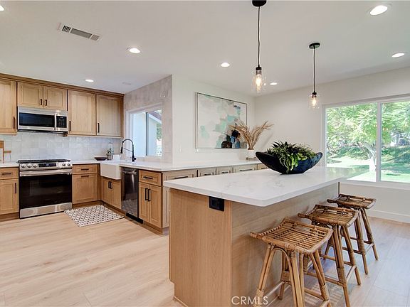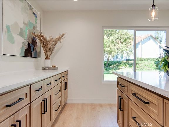 Welcome to the beautiful 55+ community of Casta Del Sol. This recently renovated home is located on a quiet corner lot on a cul-de-sac street close to gate 3. The home has been transformed into an open concept with an elegant kitchen showcasing an abundance of white oak cabinets featuring soft-close drawers, large island, elegant quartz countertops and stainless-steel appliances. The high ceilings, custom designed fireplace and newer double paned windows give a soft and cheerful space to the living room. Direct access to a patio overlooking a green belt enhances the outdoor California living. The master and guest baths have been designed and renovated to complement the rest of the home. Luxury vinyl and tile flooring with custom doors, trim and colors complete the home. This home is truly a masterpiece of design and functionality, offering a lifestyle of comfort and sophistication. Attached garage and on-street parking next to the home make guest parking close and easy. The Casta Del Sol HOA amenities include beautiful landscaping throughout the 484 acres with mature trees and gorgeous hillsides. The association offers 2 recreation areas with clubhouses, pools, spas, tennis, pickleball and so much more! There are many social clubs and activities, catering to a vibrant and active lifestyle. The association provides trash pickup and outside painting. Lake Mission Viejo membership includes swimming, fishing, sport courts, concerts and more.