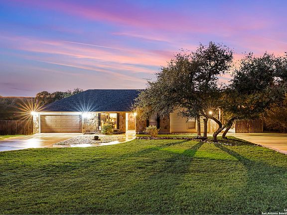 Discover your own Hill Country retreat just minutes from the sparkling waters of Canyon Lake, one of Texas's deepest lakes, boasting over 80 miles of scenic shoreline for year-round outdoor fun. This single-story ranch home is set on a private, expansive lot that stretches past the fenced backyard to a creek bed, giving you space to explore and breathe. Step inside and you'll find an airy, open layout anchored by beautiful stained concrete floors that make daily living easy. The 2023 kitchen update includes a dual oven/range and new dishwasher, while fresh paint and LED lighting brighten every corner. A newer roof (installed in 2023) provides peace of mind. The thoughtful floor plan features three bedrooms down one hall for privacy, an office tucked away on the opposite side of the home, and a laundry room conveniently located off the kitchen. Outside, soak in sweeping Hill Country views from your spacious backyard. A large concrete framed deck along the back fence invites gatherings ~ from sunset dinners to game nights and s'mores around the rock fire pit. There's also a covered concrete parking pad on the side of the home, ideal for RV or boat storage. Come and experience this slice of Hill Country solitude, where tranquility, convenience, and natural beauty come together just moments from the lake.