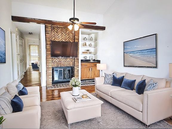 One story brick home features 2 bedrooms, 1.5 baths, interior freshly painted, large great room w/vaulted ceiling & brick fireplace. Spacious kitchen with lots of cabinets, smooth cooktop, breakfast bar, dining room, and laundry closet. Refrigerator, washer and dryer stays. Primary bedroom with bath, Storage building. Roof 7 years old.