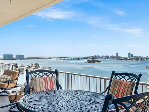 Stunning views of blue water and islands all the way to Perdido Pass by day, and city lights by night! A rare high floor unit in the coveted Bayshore Towers complex does not come along often. This immaculate 3BR 3BA comes impeccably furnished. Enjoy sunsets across the water from the large balcony with a natural gas plumbed grill. This luxury unit features 10' ceilings and crown, large ensuite bathrooms and walk-in closets in all bedrooms, high-end appliances, granite countertops, beautiful LED lighting, abundant storage with built-ins, tasteful shiplap accents, gas fireplace and more! The 5+ acre property is gated with a beautiful entry and winding drive through lush manicured landscape with tennis courts, secluded private park with fruit trees and woods, one indoor and two outdoor pools, two hot tubs, and a beautiful sprawling marina. Day slips are available on a first-come first-served basis (deeded slips can be purchased separately). The complex has onsite management, exercise rooms, and a common room with bar for events. A must see!