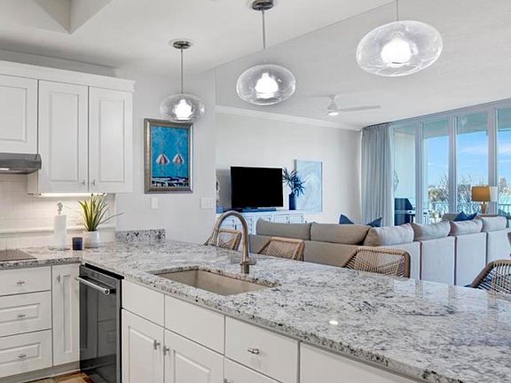 Immediately upon entering this exquisite 3BR 3BA home, you’ll experience a sense of refined elegance & sophistication. This home underwent a complete remodel concluding in 2024, with designer finishes, high-end appliances & fixtures, and luxury furnishings to satisfy the most discerning taste. 10’ floor-to-ceiling glass in the main living area and primary bedroom offer views of the water, passing boats by day & city lights at night. Shimmering with freshly painted walls, trim & crown, with new coastal LVP flooring, as well as new lighting, ceiling fans, sinks & faucets and custom window coverings, all the rooms look & feel like new construction. A sense of modern grace is exuded throughout with new high-end furnishings from Bassett, Universal & Uttermost, curated with original artwork, decor & designer rugs. The kitchen features new granite counters, tile splash, KitchenAid appliances & a Cafe Induction Cooktop with cookware. All ensuite bedrooms offer comfort & relaxation with stylish furnishings, decor, Stearns & Foster mattresses, large closets and baths with new tile & glass showers, granite and fixtures. The spacious redesigned master bath features a new large shower with custom glass & tile, a new linen closet and a separate vanity. A bonus room currently used as owner’s art studio could be utilized as an office or 4th bedroom. All elements have been updated, including HVAC, water heater & washer/dryer, with whole-house water filtration system & Samsung TVs added. The enormous balcony features a new gas grill & LuxCraft polywood furniture. The 7+ acre property is gated, with lush manicured landscaping, 2 tennis/pickleball courts, 2 outdoor pools/spas, exercise rooms, common room with wet bar, and a new marina with first-come slips available. There is on-site management and a minimum 60-day rental - no vacation traffic to deal with. Garage parking/storage #67 is available for separate purchase. A MUST SEE! Buyer to verify all information during due diligence.
