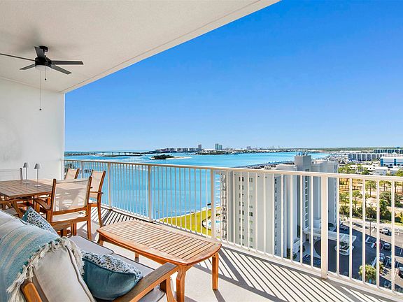 Penthouse unit in the coveted Bayshore Towers Condominiums! Breathtaking water views surround you from all sides of this spacious 3BR/3BA end unit. This condo is made for entertaining with its massive balcony for watching sunsets across the water and panoramic city lights at night. With floor-to-ceiling glass across the entire living area and primary bedroom, your views include Terry Cove, the islands and bridge, and the Gulf...with the cities of Orange Beach and Gulf Shores as a backdrop. The entire condo has been tastefully updated and features luxury furnishings, high ceilings, motorized shades, crown, new lighting and fixtures, and more! The chef's kitchen boasts high-end stainless steel appliances with veined white quartzite and full-height splash. All bedrooms are spacious and have water views, custom plantation shutters and ensuite bathrooms. The oversized primary bedroom features a window curtain wall with access to the patio, custom closet built-ins, and a large 5-piece bath with a built-in makeup table. There is a bonus room currently being used as a 4th bedroom that could also serve as an office or studio. This unit has a covered GARAGE SPACE and storage unit available for separate purchase, and a BOAT SLIP with an 18k lb lift available for separate purchase. The 7+ acre gated property exudes a tropical estate feel, with lush manicured landscaping, 2 tennis/pickleball courts, 2 outdoor pools/spas, wooded park, exercise rooms, common room with wet bar, and a new marina with deeded, as well as first-come first served slips. The property has on-site management and a minimum 60-day rental restriction - no vacation traffic to deal with. A must see! Buyer to verify all information during due diligence.