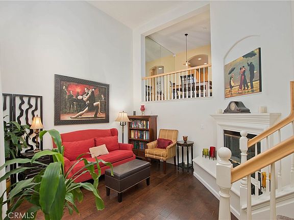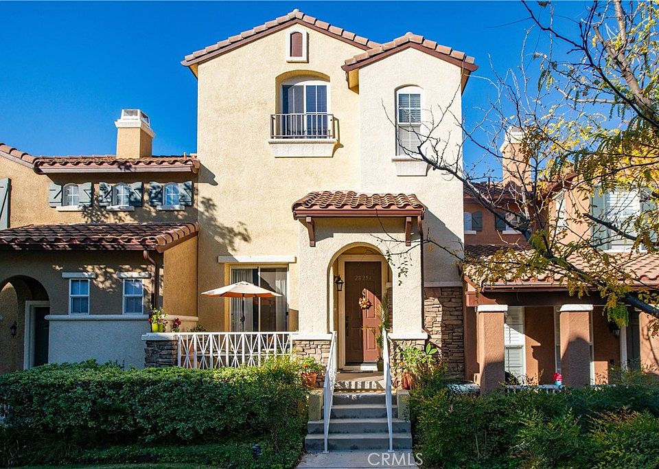 Welcome to this charming 2 bedroom, 2.5 bathroom townhome located in the highly sought-after Village Walk community in Valencia Northpark. Stroll along the beautifully landscaped pathways shaded by mature trees and arrive at the inviting front entrance. Inside, the first floor features a cozy living room with a warm fireplace, beautiful birch wood flooring, and serene views of the patio and greenbelt. Upstairs, the second level boasts a formal dining room that overlooks the living room, creating an open feel. Adjacent to the dining space is the bright kitchen, complete with tile countertops, white appliances including a new dishwasher, and a breakfast bar. The kitchen seamlessly connects to a comfortable family room. A convenient powder room is also located on this level. Birch wood flooring continues throughout the first and second floors, adding to the home’s cohesive design. A built-in desk at the stair landing provides an ideal workspace for a home office setup. On the third floor, you’ll find both bedrooms. The primary suite features a walk-in closet and an en-suite bathroom with luxury vinyl flooring. The secondary bedroom also includes its own private bathroom with a shower/tub combo and luxury vinyl flooring. The laundry area, equipped with a stackable washer and dryer, is conveniently located near both bedrooms for added ease. Step outside to the private patio—an ideal space for BBQs, morning coffee, or simply relaxing while enjoying the peaceful greenbelt views. Additional highlights include an attached two-car garage with direct access and access to the community’s sparkling pool and spa. Ideally situated near parks, schools, shopping, dining, and Valencia’s scenic walking paseos. Best of all, there is no Mello Roos!
