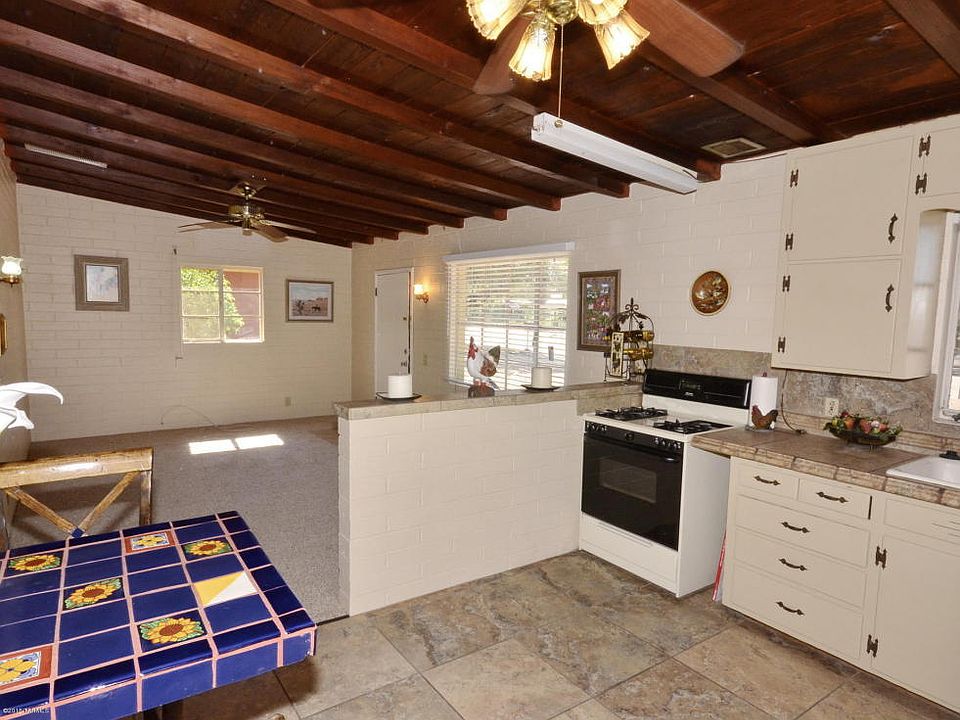 THIS HOUSE IS ADORABLE! INCREDIBLY CHARMING WITH 1950'S WOOD BEAMED CEILING, ROLLING SHUTTERS, 3 YEAR OLD A/C AND HEATING SYSTEM, CEILING FANS IN ALL ROOMS, BRAND NEW CARPET, FRESH PAINT INSIDE AND OUT PLUS RECENTLY REMODELED BATHROOM WITH GORGEOUS TILE SHOWER. THERE HAS BEEN A COMPLETE REPLACEMENT OF ALL PLUMBING PLUS 3 YEAR ROOF WARRANTY. THIS HUGE, PRIVATE YARD WITH CATALINA VIEWS IS PERFECT FOR PETS, KIDS OR FUTURE POOL. ENJOY THE COVERED PATIO WITH BUILT-IN SHELVES AND SEPARATE LAUNDRY ROOM WITH STORAGE. LOCATION IS FANTASTIC NEAR SWAN AND GLENN, CLOSE TO RESTAURANTS, SHOPPING, TUCSON MEDICAL CENTER AND MORE! LISTING AGENT IS SELLER.