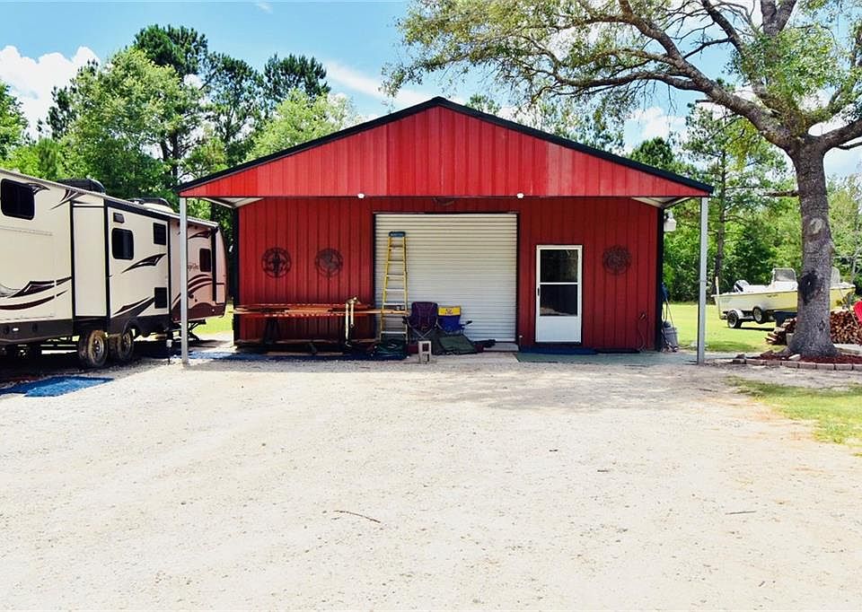 Gorgeous 16+/- acre tract including 30 and 50 amp service. 30x50 shop is not completed, concrete flooring, open living and kitchen, and one bathroom, has room for additional build out. 5 acres are cleared, entire property is outlined by trees, 2.5 acre stocked pond with a dock and canoes. This home site is truly amazing, and already has a 60x60 house pad. Furniture is optional, some appliances stay. This property will not last long, very private entry and not in a flood zone! Call today!