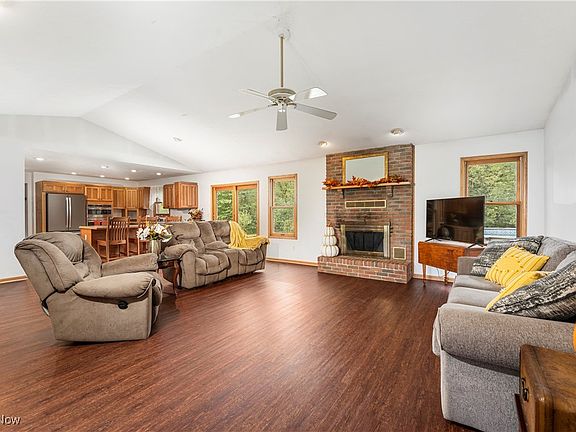 This charming brick ranch home offers 4 spacious bedrooms, 2 full Baths, and 2 half baths, all situated on a serene 5+ acre lot within the desirable Lake Local School District. Enjoy the ease of single story living with ample room in this open concept layout. This large master suite is a true retreat, featuring a spacious layout that offers plenty of room to relax and unwind. It boasts a huge walk in closet with easy accessibility. The master bath adds a touch of luxury, providing a private oasis with a large soaking tub, dual sinks and a separate shower. The open-concept kitchen seamlessly flows into a spacious great room, creating a perfect setting for both everyday living and entertaining. The kitchen features newer appliances, 2023=oven, microwave, Dishwasher, 2024= Refrigerator, 2022=Cooktop. The Enormous Basement Rec room is the ultimate entertainment hub, featuring a pool table and air hockey table for endless fun. Tucked away is a hidden "Harry Potter" closet, adding a touch of whimsy and extra storage or play space. A convenient half bath is also located in the lower level, making it the perfect spot for hosting game nights or relaxing with family & friends. The expansive property provides plenty of outdoor space for recreation or relaxation, with the potential for gardening, or even a small hobby farm. The above ground pool and its equipment remain with the home. There is a large clearing into the woods with a firepit, and there is a toboggan hill that is shared with the neighbors. They are at the top of the hill and this property is the bottom of the hill. This home combines the tranquility or rural living with the convenience of nearby amenities and excellent schools. New Roof February 2024, New Carpet in 2 bedrooms July 2024, Ohio Waterproofing and finished basement with half bath 10 years ago. New Furnace and A/C in 2016, water softener 2020, 1st floor flooring Fall 2023. Schedule your private showing today.