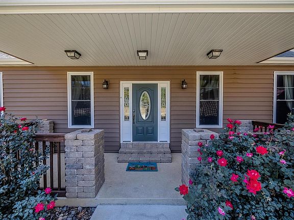 The home features a thoughtful split-bedroom design. The kitchen is equipped with beautiful hickory cabinetry, double ovens, and ample space for gathering and entertaining. Step outside to enjoy the serene surroundings on the covered porch