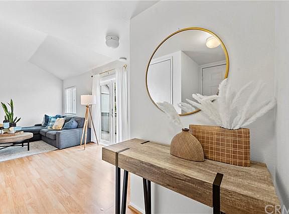 Beautiful upper-level condo in the much sought-after resort community of Villa Mira offering community clubhouse, 2 pools and spas all within close proximity to schools, restaurants, and freeway access. This bright two bedroom, two bath condo boasts smooth laminite flooring, modern Thermofoil kitchen cabinets, artic white Quartz countertops with 7" backsplash, stainless steel appliances, new double pane windows, dual sink vanity with cultured marble countertops. Laundry hookup and single car detached garage with plenty of storage for all your belongings. A private exterior patio that offers peace and tranquility to enjoy your morning coffee & newspaper. Other interior features include new carpet in bedrooms, mirrored closet doors, open layout with LED recessed lights along with Leanne Ford lighting, cathedral ceilings offering nice natural light. This home was repiped with PEX plumbing in the last four years.