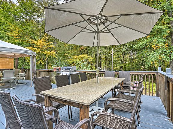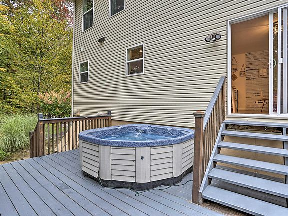 Exquisite TURN KEY home located in a four season amenity filled community in The Northern Poconos, within 2 hours of the NYC and Philadelphia Areas. This 4 bedroom, 3 bath home has been beautifully updated and modernized and has CENTRAL A/C. In addition to the amazing interior, there's awesome outdoor space and landscaping too! The open floor plan offers the perfect flow; a beautiful entry, living room with propane fireplace, large dining area, kitchen with breakfast nook and a family room. The second level has a nice sitting area at the top of the stairs, master bedroom with beautiful master bathroom. The finished lower level has a huge great room with Home Theatre for entertainment and fun. Paved Driveway with plenty of parking.