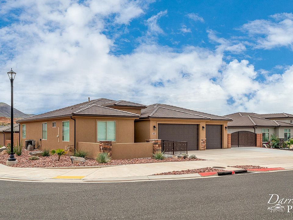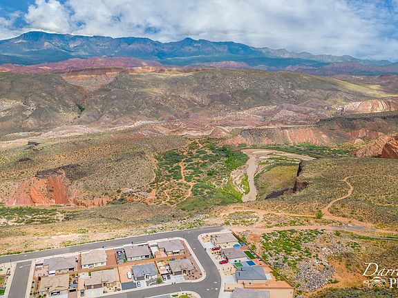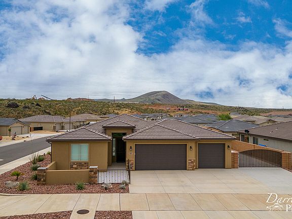 Enjoy the MAGNIFICENT VIEWS in this gorgeous area. Take in the serene Red Rock views and Pine Valley Mountain from your beautiful courtyard. The custom-built 3rd car garage extends to an impressive 12 feet wide and of 31 feet deep, making it perfect for a workshop, side-by-side or motorcycle parking, or simply as additional storage. Step inside where you'll immediately appreciate the unmatched comfort provided by the beautifully crafted tile wood-look flooring, stylish plantation shutters that adorn every window, and exquisite granite counter-tops.