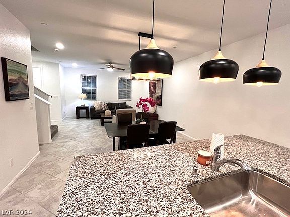 This highly desirable 3-bedroom townhome is perfectly situated within walking distance to the Inspirada's largest park, Aventura Park. Wallk to majestic Sloan Canyon, offering both convenience and natural beauty at your doorstep. Unique among its peers, this home boasts a garage driveway, a feature not commonly found in this model, adding an extra layer of convenience for homeowners. The interior is thoughtfully designed with a practical loft space, providing ample room for a home office, play area, or additional living space. The downstairs area is adorned with tile flooring, ensuring durability and ease of maintenance, while the upstairs has been refreshed with new carpet, giving it a cozy and inviting feel. The entire home has been recently updated with fresh paint and modern light fixtures, making it move-in ready for those seeking a blend of comfort, style, and exceptional location.