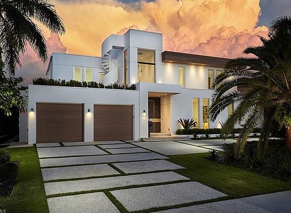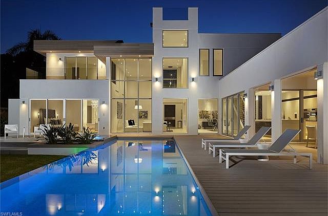 Reflecting a blend of Californian and European design, 2828 Crayton has set a new level of architectural style in Naples offering the latest products from across Europe and attention to every detail by Lime International Decor. Prominently positioned on Crayton Road, the home boasts spectacular panoramic golf course views from its huge two-story walls of glass bringing the outside tropical paradise in. The southern and eastern exposure of the 44-foot double infinity-edge lap pool, spa and deck captures all-day sunshine. Relax in the covered outdoor living and dining area, with television, electric screens and a gas fireplace for those cooler evenings. Friends and family will enjoy sunsets from the third-floor 420-square-foot rooftop sky lounge with 360-degree views across the bay toward the Gulf. Have it all. Close to beaches, minutes to downtown, golf course views and a cutting-edge design.