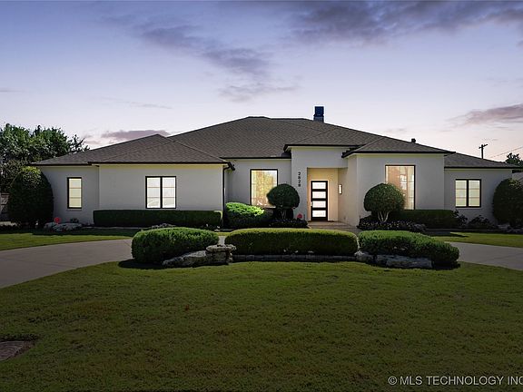 Custom-built, single level home located in prime midtown location near Tulsa Tennis Club. Offering approximately 4400 SF, this 4 bedroom, 4.5 bath home features a combination of luxury and practicality for everyday living. The exterior has painted, white brick, side-entry garage, plus circular driveway, and impact-resistant roof. The home has high-end finishes, wired for smart home automation, built-in stairs to the attic w/ spray foam insulation, 3 high-efficiency HVAC systems, 2 tankless hot water systems, 12’ and beamed ceilings, solid wood doors, electric shades throughout, and wood-clad Anderson windows and doors. The oversized 3 car garage includes epoxy flooring, and walk-in tornado shelter. The light-filled interior has white oak hardwood floors throughout, 6" crown molding & custom hardwood cabinetry. The kitchen is designed with  marble countertops, spacious island with seating for 5 or 6, a walk-in pantry, and equipped with 3 ovens and side-by-by refrigerator/freezer. The functional floorplan includes both formal and casual dining spaces and two spacious living areas, plus a separate office. The primary suite includes a fireplace, marble bathroom with heated floors, dual vanities and soaking tub, and generous custom storage in walk-in closet with adding laundry room. Additional rooms includes three en-suite bedrooms each with walk-in closets. The outdoor area features a covered patio with brick fireplace, private backyard with ample room for pool, and sports court.