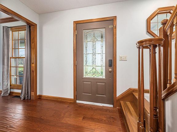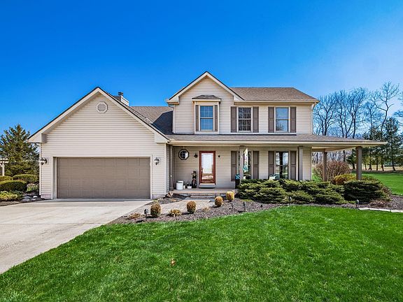 A stunning 4 bedroom, 2.5 bathroom property situated on 1.8 acres in Rushcreek Estates! You'll love coming home to the ample outdoor living spaces, including a massive rear covered patio and also a built in fire pit area, perfect for entertaining guests. Inside, the updated kitchen features granite countertops and stainless steel appliances. Hardwood floors throughout the first floor with new carpet throughout the rest of the home adds a luxurious touch. The master suite features vaulted ceilings, dual sinks, walk in closet, jetted tub and a shower! The finished basement area adds nearly 1,000 square feet of living space! You'll appreciate the She-Shed and the 3+ car detached garage for extra storage or parking and a full concrete driveway. Come see all this home has to offer today!