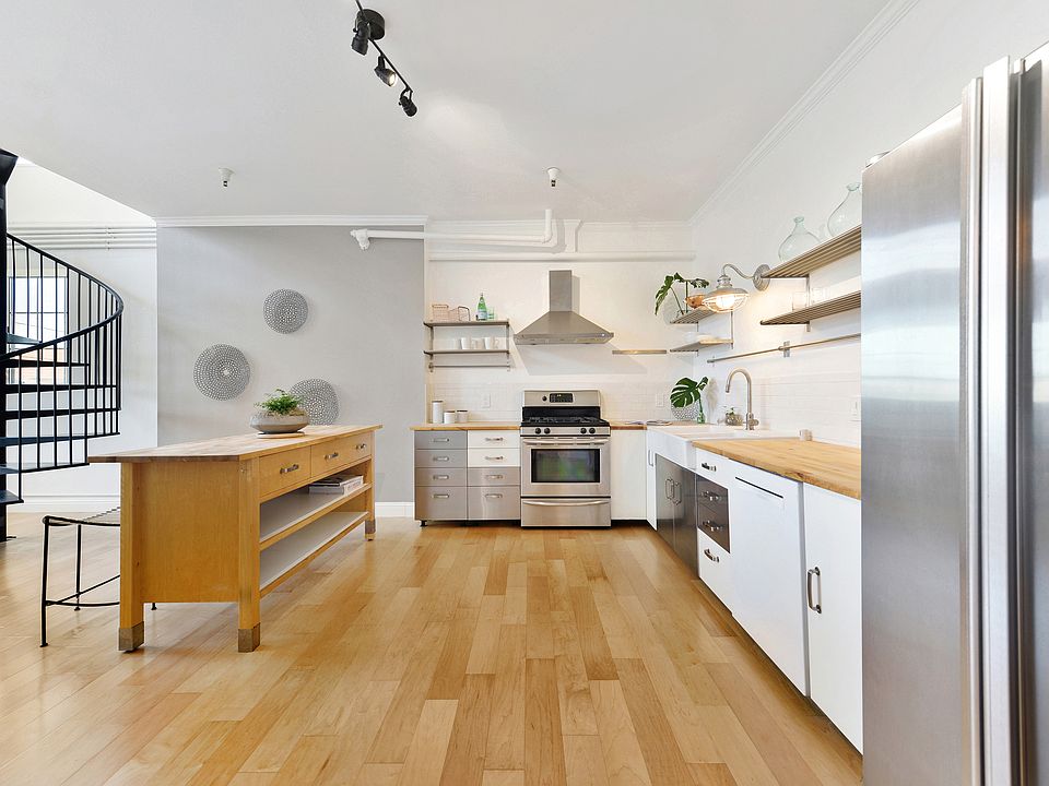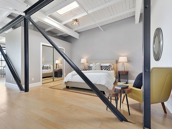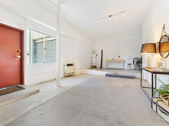 Spacious tri-level corner unit loft with soaring ceilings, gleaming wood floors throughout and dramatic open floor plan. The large kitchen and dining area open to a vast two-story living area with gas fireplace. Twin spiral staircases lead to the upper floor where two bedroom areas overlook the main living area. Warehouse-style steel frame windows, exposed pipes and beams, and a catwalk leading to additional flex space, give this loft a classic industrial elegance. A workshop/art space and laundry area on the ground floor lead to a secure gated parking area for two cars just outside. Located in a vibrant, rapidly growing West Oakland neighborhood with friendly neighbors, minutes from BART, freeways, and lots of local shops and restaurants.