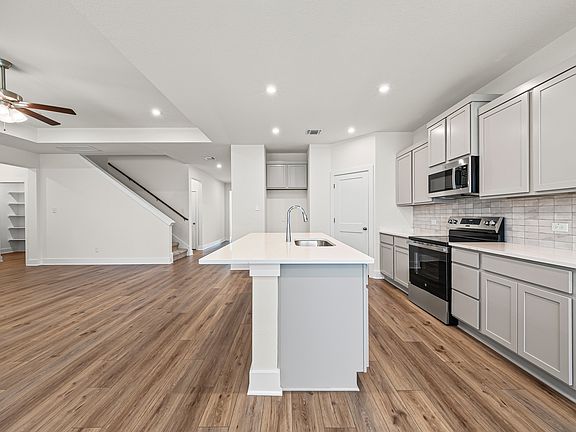 Bold design and warm tones define this 4-bedroom, 3-bath home in Temple's North Point community. Spanning 2,801 square feet, this thoughtfully designed layout blends spacious living with elegant finishes. Inside, Bluff shaker cabinets pair beautifully with Mystere Gold quartz countertops and a soft Antigo Vanilla backsplash in a straight-set pattern. The kitchen also features a stainless-steel undermount sink, chrome fixtures, and is lit by efficient LED downlighting. Brushed nickel lighting adds a soft glow in the family room and bedrooms, while Flax-toned carpet and Wild Dunes vinyl plank flooring offer a balance of texture and comfort. Bathrooms are appointed with Glacial quartz counters and sleek chrome hardware, set against striking Arabescato Gold wall tile. Walls in Alabaster are accented by Omega White trim and doors. Outside, the home impresses with Foothills siding, Austin White Sawn stone, and a distinctive Evergreen Fog Medallion-style front door-classic curb appeal with a modern edge.