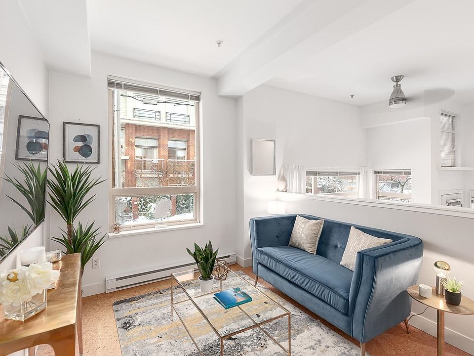 Work from home! Gorgeous 1 bedroom plus den townhouse in popular Domain Building located at the corner of 12th & Main on the quiet side of the building. Open & super functional floorplan, high ceilings, chefs kitchen with designer soft closing cabinets, stainless steel appliances, super resilient cork flooring, quarts countertops. Huge Master bedroom & plenty of additional closets and organizers & 2 XL storage rooms! Enjoy the convenience of living steps away from shopping, fine dining, coffee shops & accessible to all areas of Vancouver. Come and enjoy all that Mount Pleasant has to offer. Quick completion possible. All Buyers please have your Realtor contact Listing Agent to book your desired showing time.