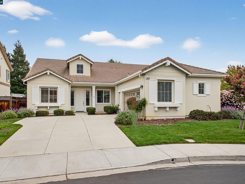 Beautiful single story home on corner lot featuring 10 foot ceilings, 4 bedrooms, 2 bath with 2 car garage. The front bonus room with ceiling fan could be an office, extra bedroom, exercise room, the possibilities are endless. A raised hearth with gas starter fireplace in family room. Kitchen has it all and more-spacious pantry, ample space for a bistro table and chairs, breakfast bar, island with veggie sink, tile floors and counters, desk area, storage, HOA includes community pool, spa, and clubhouse. A very elegant home that should not be missed. Envision your family in this open, bright and beautiful home. The oversized main bedroom has a ceiling fan, walk in closet and attached bath with a soaker tub. The separate dining room with its warm and intimate light fixture is perfect for those special occasion meals with family and friends. Stone Patio is perfect for barbeques and outdoor entertaining. Easily maintained yard with mature orange tree in yard. Walk to several parks, pool, schools. Close to shopping and transportation. Come by and fall in love with this home.