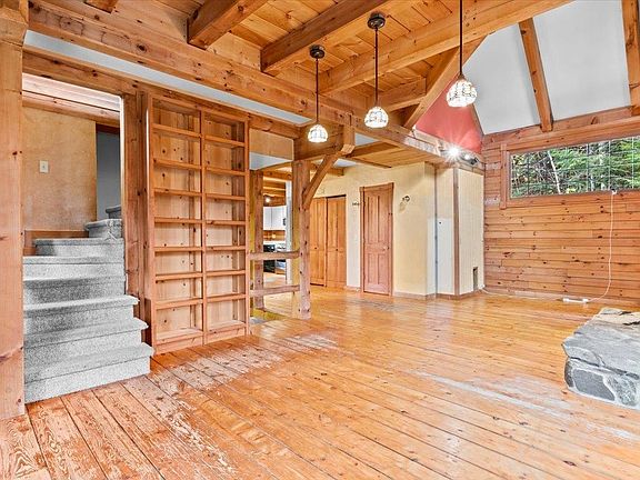 Timber Frame Chalet located on the mountain road to Smugglers Notch Resort. Main floor offers open floor plan through kitchen, dining and living room with softwood floors, tons of natural light, cathedral ceilings and exposed beams. Enjoy access to the mudroom, three season porch, ½ bathroom, fieldstone fireplace, laundry room and french doors to the covered porch all from the main floor. Head upstairs to the large primary bedroom with full bathroom, ample closets and lofted room perfect for home office or lounge area. Downstairs you’ll find two bedrooms, full bathroom and utility room with easy walk-up access to outside (perfect for dumping skis and boots after a long day on the mountain). Enjoy the property from the extensive covered porch with landscaping that includes perennial, rock gardens with raised beds requiring a little TLC to bring back to life. The location offers easy access to the resort, schools, shopping, wedding venues and more allowing for a perfect family residence or investment property.