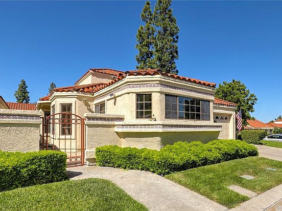 Fantastic 3 Bedroom, 3 Bath detached home in sought after Casta del Sol - a guard gated 55+ community in beautiful Mission Viejo. Starting with great curb appeal, the home begins with a private gated courtyard entry which leads into a welcoming foyer and opens to the center of the living spaces. On the right, is a large, light and bright formal dining room and beyond is a spacious eat-in kitchen. With an abundance of prep and storage space and an eat-in corner nook, the kitchen is anchored by large windows that look out to the charming street. To the immediate left of the entry is a guest bedroom or den and a guest bath. Beyond is a spacious living room with soaring cathedral ceilings and a cozy brick fireplace. An abundance of bright light from multiple windows and a door out to a relaxing patio adds to the appeal. Completing the lower level is a grand master suite offering vaulted ceilings and a private door to an additional patio area. A large dual sink vanity bath, a walk in closet and a spacious shower complete the master. Upstairs is a large loft, perfect as an office or third bedroom, a full bath and a private rooftop deck. Situated on a corner lot, green space is just outside and the home is steps from a quiet interior street where neighbors can be seen enjoying a stroll. Enjoy resort style amenities such as pools, tennis, fitness, meeting/activity rooms plus so much more! You are also just minutes from fantastic dining, shopping and outdoor activities.