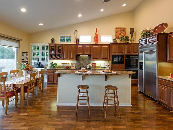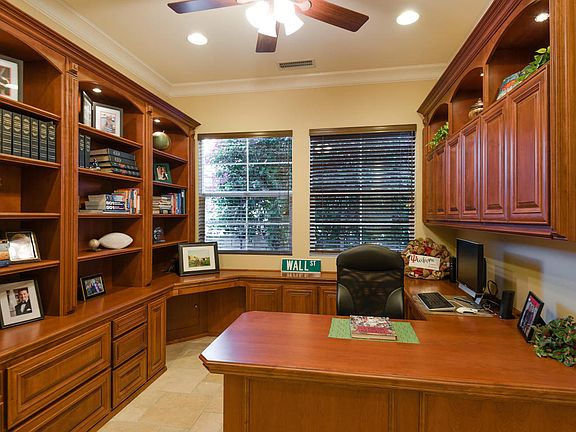 Welcome to this stunning 3348 SF single story 4 BD, 3.5 BA + office and loft located within the guard gated Woodridge Estates. This beautiful home boasts gleaming hardwood and tumbled travertine flooring in the living and dining spaces, and plush carpeting in the bedrooms, living room, and loft. The kitchen opens to the family room and showcases slab granite counters and breakfast bar, double oven, built-in stainless steel refrigerator and attached butler's pantry and walk-in pantry area. The family room has a built-in entertainment center with built-in surround sound speakers, a cozy fireplace with mantle, and plantation shutters. The bedrooms include a large master suite with direct access to the backyard, 2 closets including a huge walk-in with built-ins,