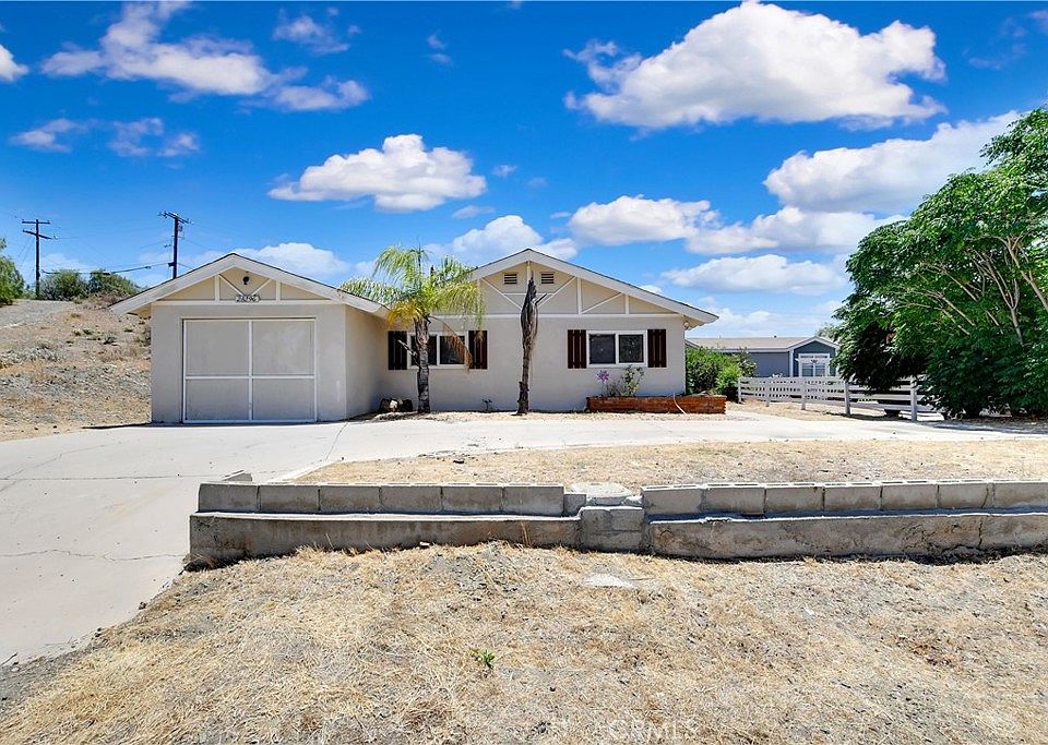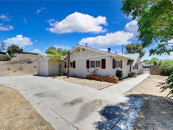 This single story Menifee home offers 1050 square feet of living space with three bedrooms, one bathroom, and a single car garage, all situated on a spacious 9583 square foot lot. The backyard also features a detached workshop, perfect for projects, storage, or creative space. Inside, the spacious living room takes center stage, boasting a cozy brick fireplace and an abundance of natural light from the windows and access the backyard through the sliding glass door, perfect for indoor-outdoor living. To the left of the entry, a hallway leads to a wall of cabinets for extra storage, two bedrooms, each offering laminate flooring, ceiling fans, ample closet space with sleek sliding mirrored doors, and plenty of natural light through the windows. Also along the hallway is a full bathroom featuring a shower tub combo, single sink vanity, and tile flooring, as well as a convenient laundry room equipped with built-in cabinets for added storage and functionality. The bright and spacious kitchen showcases granite countertops, and stainless steel appliances including a 4 burner electric cooktop and oven, range hood, and dishwasher. Just beyond the kitchen, the master bedroom includes laminate flooring, a ceiling fan, Ample closet space with sleek sliding mirrored doors and a sliding glass door leading to the covered backyard patio. The backyard offers a spacious, blank canvas ready for your personal vision, complete with a covered patio for outdoor relaxation and a detached workshop, perfect for storage, hobbies, or DIY projects. This home is conveniently located near shopping centers, freeways, and highways, this home offers the perfect blend of comfort and accessibility.