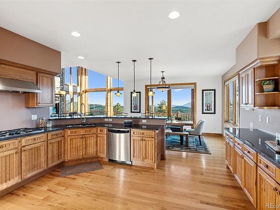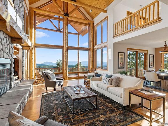 The “Eagle’s Nest” is available at the top of the gated Belle Meade neighborhood in Conifer. Have you been waiting to be inspired? This 10 acre mountain masterpiece has commanding views of the Rocky Mountains across multiple horizons, the purple mountain majesty of Pikes Peak and the entire Kenosha Range including overlooking segments of the Colorado Trail. Here you’ll be surrounded by luxurious finishes & details while you watch the sun rise from the elite private setting at the end of an easy paved road. The adventure starts where the road ends and Eagle’s Nest is the most amazing spot to write your story. Perfectly designed to capture the awe inspiring views & drama only found in a place of unique grandeur. Huge vaulting through exposed log trusses & wrapped in river rock—this is the quintessential Colorado home. Sit by the roaring fire while you watch the sunset surrounded by the comforts of a well considered & impeccably built home. Luxuries like 8’ alder doors, handmade light fixtures & the live edge on the granite slab combine to create an impressive & comfortable setting. The main floor master suite provides a sumptuous getaway without stairs & boasts a generous walk in closet, beautiful 5 piece bath w/corner spa tub creating a relaxed setting surrounded by the mountains. Stroll directly from your bedroom on the huge deck perched in the rock outcroppings-above it all. There’s room for everyone with 4 bedrooms—2 of which are on the main, and 2 upstairs, the tremendous family room open to dining and kitchen, another family room and loft upstairs—with its own deck taking the views even to another level. A special surprise is the secret room beyond the three car garage! A space perfect for a speakeasy, game room, home office or a yoga studio- space only limited by your imagination. Impeccably maintained w/the ideal combination of flat driveway & yard, the home seamlessly integrates the living spaces with the forest, vast rock outcroppings and the view.