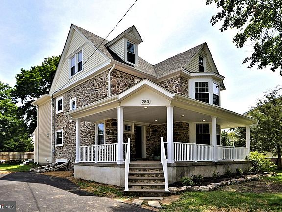 283 Abrams Rd is a perfect combination of Old-World charm and modern conveniences. Every detail has been addressed in this original Upper Merion Farmhouse built prior to 1900. Pull into the new driveway and fall in love with the gorgeously re-pointed stone exterior and the expansive front porch, rebuilt and restored to its original size and grandeur. Enter through the original front door, step into the inviting foyer and be awed by the original hardwood floors, deep windowsills, crown molding, original trim, and the original farmhouse staircase that has been restored to beauty. A coat closet and powder room are off the foyer, as well as the living room which boasts a gas fireplace with a custom coffered ceiling and a view of the front yard. The dining room will impress you with its beautiful re-pointed stone wall and custom wainscoting throughout the room. You'll have everything you need in the modern kitchen, from the gorgeous antique white cabinets with granite countertops, a tile backsplash, an extra-large stainless-steel sink, a pot-filler faucet, an 8-foot island for seating and prepping with ease, a "command center" area with wooden shelving hung with industrial-looking pipe, a large pantry closet, and included brand-new GE appliances in Slate, the hot new appliance color. The kitchen spills into the family room with another fireplace and French doors leading to the back yard. Enjoy your morning coffee on the maintenance-free deck, shaded by trees in your new back yard. Upstairs, you will find a laundry area located conveniently next to the bedrooms with storage cabinets on the wall above. The 2nd floor also includes a beautiful hall bath with patterned marble floor tile and a shower/tub combination, 2 ample-sized bedrooms with ceiling fans and closet doors custom made from original wainscoting, and a large master bedroom with a high ceiling, a walk-in closet sporting rolling barn doors and a custom closet organizer. The en suite bathroom is gorgeous with a tile shower, tile floor, a double sink vanity, a built-in storage cabinet, and a mirror custom-made from more original trim. Stairs from the 2nd floor hallway take you up to the bonus spaces on the 3rd floor, fully carpeted, with another bedroom, a full bath and a loft area that can be used as an office, art area, playroom, sitting room or whatever your family desires. The home has 2 new high efficiency dual fuel heating system and AC units (propane/heat pump) with temperatures also maintained by injection foam insulation added to the thick exterior stone walls. Other features include an instant high efficiency hot water heater, new energy-efficient windows throughout, coax cable and ethernet wired to each room, and the original 100ft-deep functional well. The basement is unfinished but is useable with plenty of space and walk-out stairs to the yard. This home has been lovingly restored with much of the original charm remaining. Don't miss out on this unique property, make your appointment today. The builder is willing to add a garage and or a finished basement for an agreed upon price, Owner is related to Listing Agents. All offers will be reviewed on Thursday July 1 at 7pm. 1yr home warranty included.