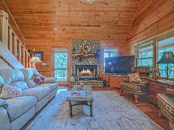 YOUR Mountain View Home is calling! Relax in your hot tub, screened-in balcony, or next to your outdoor fireplace with a new chimney and enjoy the incredible long-range, YEAR-ROUND mtn views. Spacious kitchen w/pantry, river stone FP in Grt Rm, large bedrooms +loft ofc + family/TV room downstairs. Security system, circular gentle driveway, NEW ROOF in 2021. Cabin re-stained on July 14, 2023. PRIVATE. METICULOUSLY MAINTAINED. Includes a 1 yr Home Warranty. A MUST SEE PROPERTY! Great location, good roads. Under 20min to Blue Ridge, Blairsville, Lake Blue Ridge or Nottely. YOU'RE GONNA LOVE IT! Hmmm, I think we may have underpriced it!