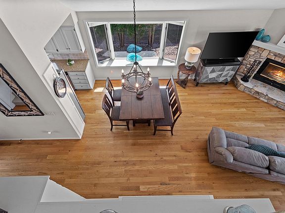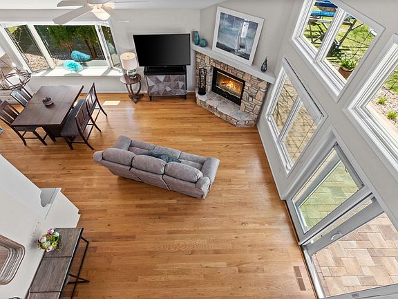 California Beach Vibe on the Bay! Year round sunsets and water views! Open concept great room with vaulted ceiling to upper open loft and office area, hardwood floors on first level, painted kitchen cabinetry & trim, Stainless steel appliances, bump out dinette, Stone woodburning fireplace. Primary bedroom with bump out bay window/with seat overlooking the Bay, walk in closet, French doors and walk through primary bath. 1st floor laundry/mud room. Upper level also has 2 bedrooms & full bath, plenty of closet space. Attached heated 2 stall garage and extra 8x16 shed with open loft for storage. Wrap around patio and wood deck to water. Dock & lift can be purchased on bill of sale at closing.