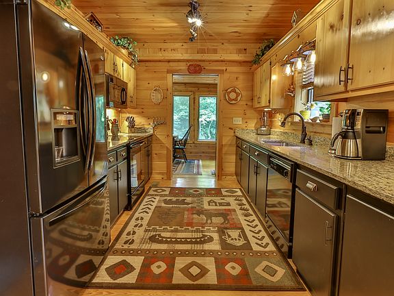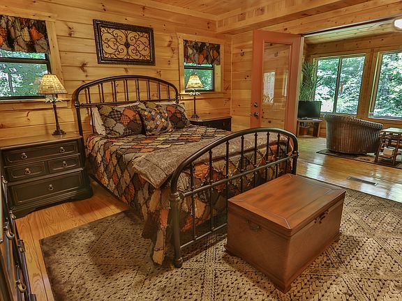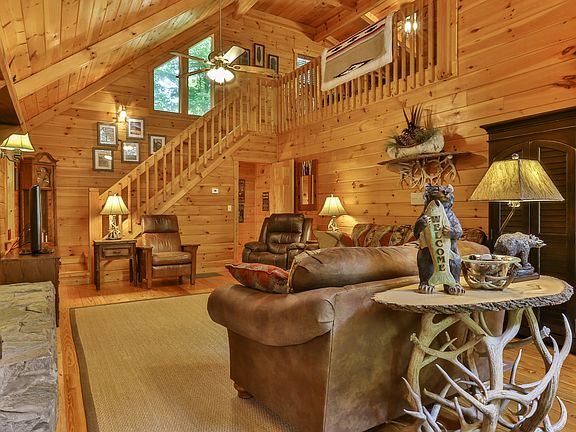 Cherry Log's Most Celebrated Community-Goose Island Hideaway-Gated w/a"Covered Bridge"over the Ellijay River.Follow Wide Paved Rds past the "River Shoreline"Common Area. Naturally Placed & Beautifully "Polished" (Furnished) Cabin w/Circular Drive to the Front Door (or Wide Asphalt"Pull Under" Driveway w/a huge Parking Pad & Garage).2016 Metal Roof,Chink Log Siding & Wrap Around Porches. Wood Interior w/Tall Vaulted Ceilings,Stone Fireplace (Flue/Gas Logs) LARGE "Bay Window", Dining Area leads to an Updated Kitchen w/Granite,Built-In Bookshelves,Pantries & 10' Extended Breakfast Nook. Spacious Main Level Master w/10' Enclosed Porch Extension. Open Loft/Office.Upper Level Guest Bdrm/Full Bath.Finished Terrace Level w/New "Wood Style"Tile Flrs