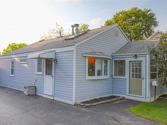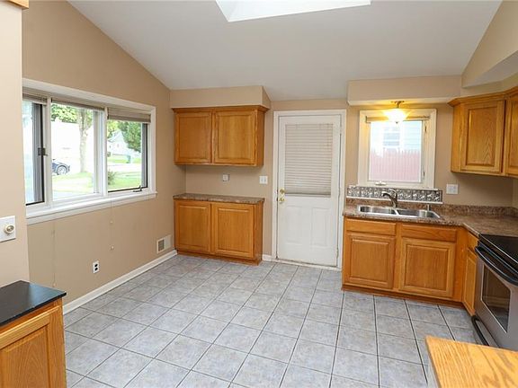 Conveniently located ranch with great curb appeal! Updated kitchen with appliances include features an eat-in area and cathedral ceiling with skylight. Open floor plan to living room where light pours in through the skylight and another cathedral ceiling. Very open and airy! Corner gas fireplace adds a great feel and warmth to both the kitchen and living room. Easy access to a great enclosed porch, perfect for additional space or an entryway. Two bedrooms on the back of the house, one with direct access to the back yard through french doors. Full bath and first floor laundry complete this great home. Extra storage available through stair access to attic. Back yard is fully fenced and features a deck with embedded hot tub. Detached garage with separate storage shed attached. Great, efficient living space with nothing left to do!