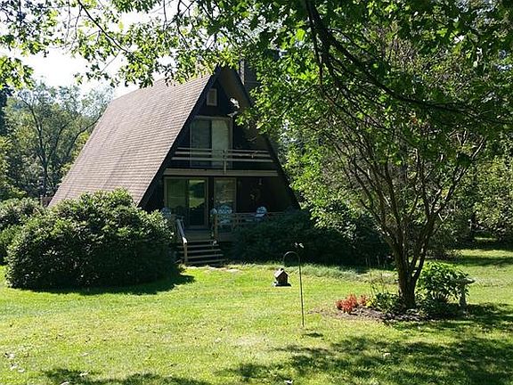 Very Cute Chalet on 3.75 Beautiful Acres with pond, 1 car Garage, lots of off Street parking, Shed, old cottage in rear of home. Bright kitchen which leads to rear deck overlooking property. Deck off Master bedroom. part finished basement with wood burning fireplaces. Large living room with front porch and another brick fire place. Basement could easily be finished with additional bedroom/bathroom. Pond is on other side of creek at rear of property. Beautiful park like setting.