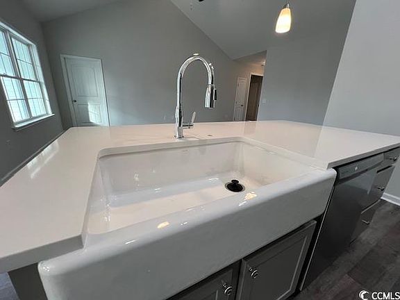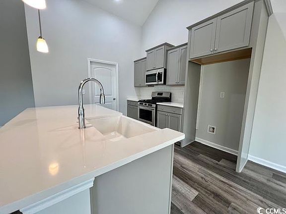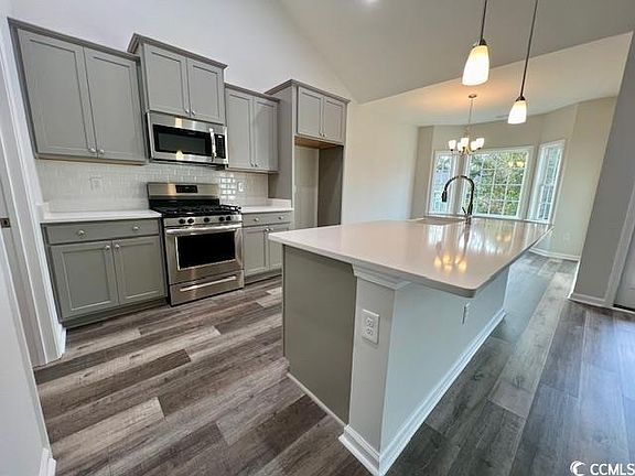 Golf cart to the beach from this beautiful custom floor ranch, complete and ready for you to move into, by the local builder voted Best of the Grand Strand and Best of the Beach for the third consecutive year! In the Ocean Palms community (Voted Best Neighborhood, 2021!). This terrific open floor plan, 3 bedroom, 2 full bath home has LVP flooring throughout - no carpet. Stainless appliances, staggered-height light grey painted Shaker-style cabinetry, marble-look quartz breakfast bar and counters, a cast iron farm sink, subway tile backsplash and pendant lights over the kitchen island combine to give you the wow factor you're looking for. Abundant recessed lighting, a bay window in the adjacent dining area and double windows plus a full glass door in the great room flood the home with light. The glass door leads to the covered rear porch and separate patio beyond, and the backyard is fully sodded. The spacious owner's retreat features a long vanity with quartz counters and dual undermount sinks, an oversized walk-in shower, plenty of storage in the huge walk-in closet and linen closet, plus a tray ceiling and ceiling fan. Two additional bedrooms, one with a bay window that could be a cozy reading nook, and a full bath are tucked off on their own hallway, for privacy. All of the homes in Ocean Palms come standard with the luxury of natural gas (tankless water heater, gas heat, and gas range). The two car garage is completely trimmed and painted, with a wifi-enabled garage door opener, and floored attic storage space accessed by drop-down stairs. Ocean Palms is conveniently located near shopping, restaurants, schools, world class medical offices and hospitals, and is only a short golf cart ride to Surfside Beach's gorgeous beach and the beautiful Atlantic Ocean. Other floor plans and inventory homes may be available. Community pool and cabana.