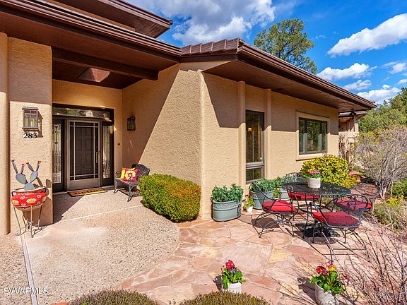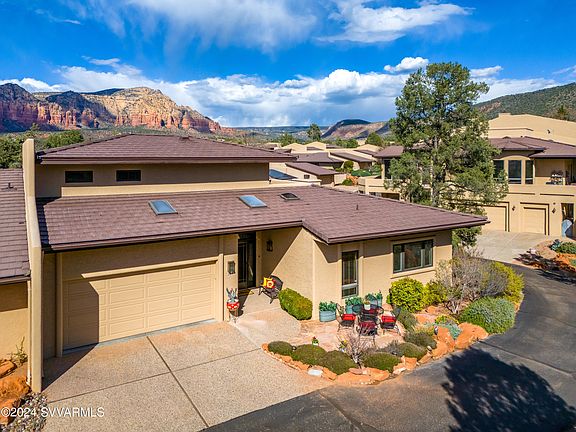 Don't miss out on a one-of-a-kind meticulously remodeled Canyon Mesa townhome. Experience quality throughout. Corner unit boasts stunning views: The South faces National Forest with trail steps away and North offers panoramic red rock vistas. The gourmet kitchen features an abundance of custom cherry shaker cabinets, a walk-in pantry, granite countertops, gas range, a bar perfect for entertaining, and playful views. The large dining and living room with gas fireplace showcase beautiful maple herringbone floors. Enjoy the landscape from these areas or step out onto the expansive 30-foot deck and take in some of Sedona's most iconic formations. The novelty maple flooring continues throughout the den and guest suite. Pocket and solid three 3 panel doors, ensure privacy. Upper-level owner's suite with cherry wood floors and private deck command attention. This magnificent space incorporates a captivating red rock backdrop. As her mood changes, so will yours. All bathrooms have been tastefully remodeled with the same quality to complement the home's style. Canyon Mesa CC allows STR. The flexible floor plan presents an opportunity to convert the den into a third bedroom. This gated community provides access to unlimited golf, tennis, pickleball, a pool, and clubhouse. All furniture and personal property items available as a separate Bill of Sale (excluding staging pieces). Roof-1 year. All living facilities on one level. Live the Sedona dream in this lovely, pristine turn-key home!
