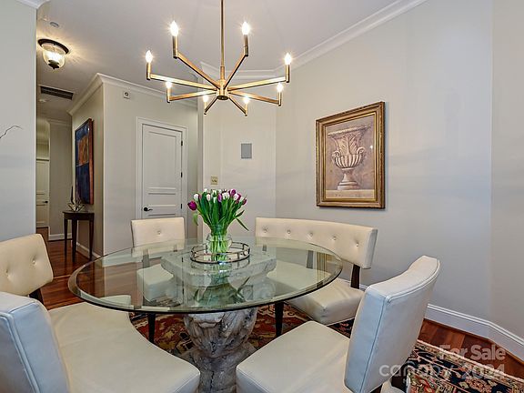 Stunning top floor unit with hardwoods, updated kitchen featuring custom countertops, backsplash, stainless appliances. The split floor plan with fresh paint throughout includes three full bedrooms. Private primary suite features two large walk in closets, beautiful walk-in shower and garden tub. Large dining room, and light-filled living room with fireplace which accesses the private balcony with installed gas grill overlooking beautiful Queens Road. This top floor unit offers seasonal views of Uptown Charlotte. Unit has 10 ft. ceilings, oversized panel doors/cabinets, and a full-size laundry/storage room. The pet friendly community features a beautiful English Walled Garden and shaded sitting area for residents to enjoy. It has secure gated entry, private garage with 2 assigned parking spaces and a separate storage room in garage. Live the lifestyle with walkability to restaurants, shops, medical facilities and more.