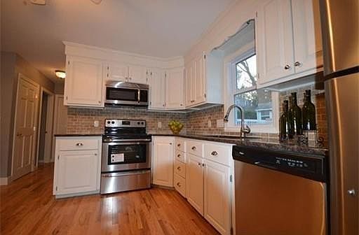 Pristine ranch in quaint, tucked in tranquil neighborhood surrounded by woods and lots of open space/nature, yet easy access to highways. Beautiful eat-in kitchen with granite counter top with ceramic tile backsplash and new stainless steel appliances.Two well sized bedrooms plus family room and office in newly finished basement with separate zone heat, Beautiful new oak floors and new carpeting. Open floor plan great for entertaining family and friends completely and tastefully renovated. New efficiency heating system, security system, replacement Andersen windows. Large 2 level composite deck and new front porch, landscaped lot with stone retaining wall. Close to schools and bus line. Nothing to do but move in. Don`t miss this one. Call for an appointment.