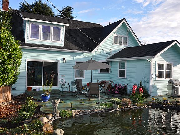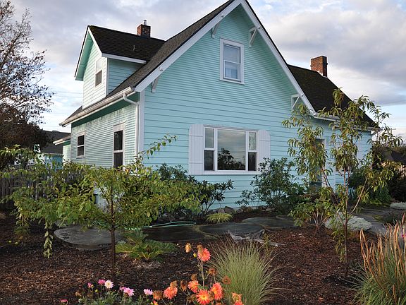 Charming 1930's Craftsman home; blocks from downtown Sequim! Large, corner/double-lot is abundant w/mature trees, fruits, & blooms. Gather with friends on the whimsical patio & admire the mountain view. The living/dining rooms are spacious w/abundant light, & include a wood stove & FP. Recent kitchen remodel offers new cabinetry, black subway tile, granite counters, & updated SS appliances. Upstairs you'll find restored, original fir floors, large bedrooms, & tiled bath. Storage & built-ins throughout.