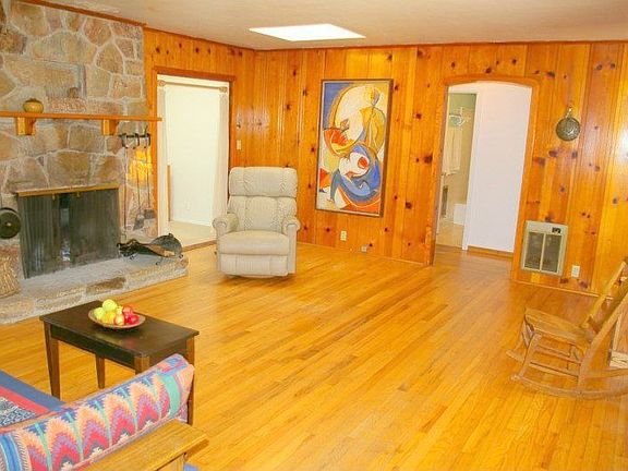 Charming getaway home is a classic 1950s California rancher on 2+ fenced gently sloped acres. A stately stone fireplace graces the sunny knotty pine living room. A bonus room with plenty of view windows can be used for family entertainment, an artist studio, or musician space. The dining room and farmer's kitchen overlook a wooded creek across the quiet lane. A variety of mature fruit trees line the property, leaving plenty of room for gardening