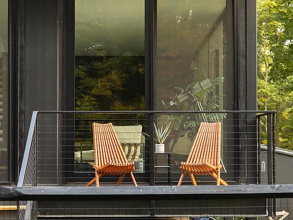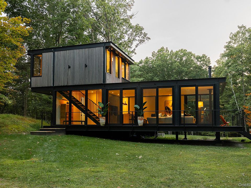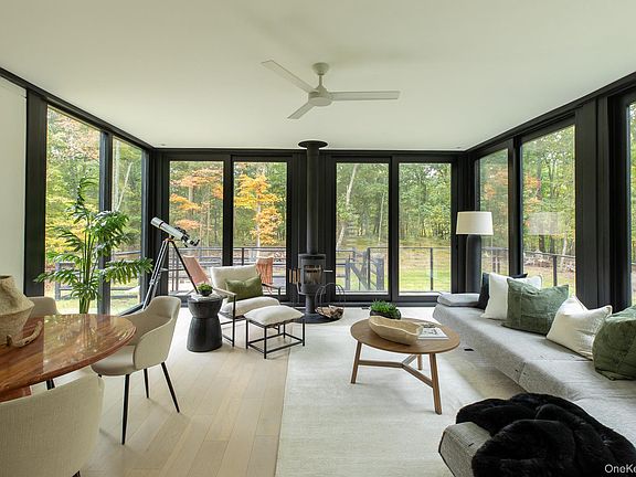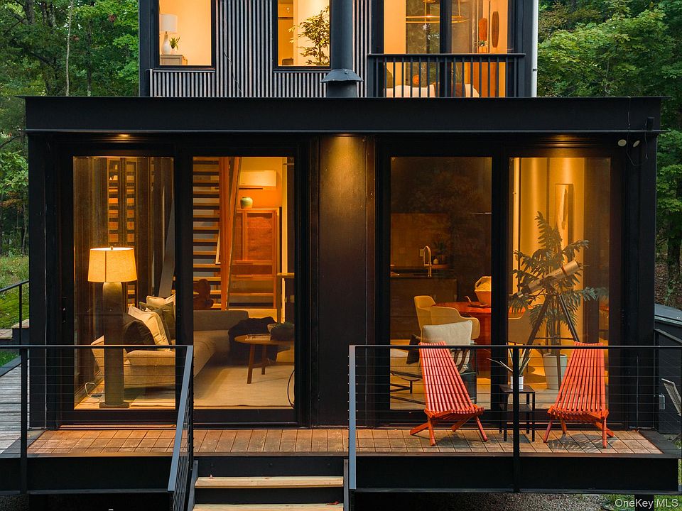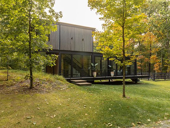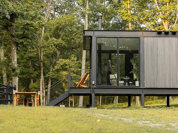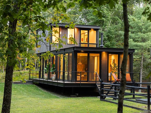 Tucked into the woods on three completely private acres, this architecturally striking, custom-built retreat is more than just a home — it’s an experience. Constructed with steel and glass, the design invites nature in at every turn, with clean lines, floor-to-ceiling windows, and a seamless indoor-outdoor connection that transforms with the seasons. The main level offers an open, sun-filled layout anchored by a minimalist fireplace and a chef’s kitchen that flows effortlessly into the living and dining areas. A full bath on this floor blends sleek simplicity with quiet luxury. Upstairs, the primary suite is perched like a modern treehouse, featuring a soaking tub tucked against a backdrop of natural rock and wooded views. A light-filled upstairs flex space acts as a guest room, office, or storage space, while a wood-heated treehouse offers a playful bonus — ideal as a creative studio or just a place to unplug. At the center of the outdoor space is a fenced-in, year-round, heated pool crafted from a repurposed shipping container — chemical-free and low-maintenance, with a secure, lockable cover. The home is fully equipped for modern living with high-speed commercial-grade Wi-Fi across the entire property, smart thermostats on every heat pump, and a whole-house generator for added peace of mind. This is a home designed to live simply and beautifully — whether as a weekend retreat or a full-time residence.