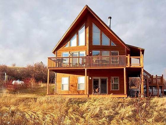 This cedar-sided home on 19 irrigated acres features a wall of south-facing windows providing passive solar. The great room features a cathedral ceiling, hardwood floor and a wood-burning fireplace with a private master suite on the loft level of the home. Two additional bedrooms, an office and a full bath are on the main level of the home. The walk-out level of the home is finished except for the flooring and plumbed for an additional half bath--just waiting for you to create your dream spa...