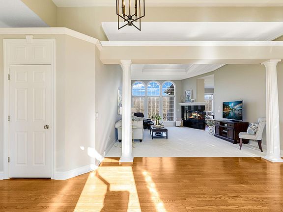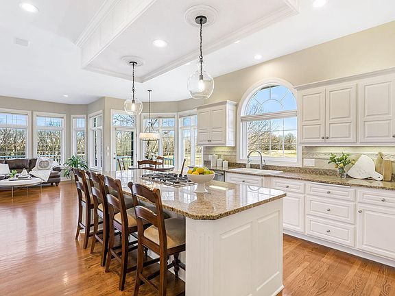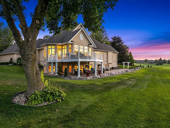 This exquisite rambler home is situated in a quiet cul-de-sac on the 5th fairway of The Wild’s golf course, offering panoramic views from tee box to green. This home boasts sophisticated finishes with attention to detail from top to bottom. Its layout is ideal for main floor living, relaxing, and entertaining. The first floor features a luxurious primary suite, expansive kitchen with Monogram appliances, sunroom, fireplace, living room, 2 dining areas, home office, laundry room & oversized heated 3-stall garage. The primary suite has a spa-like bath with domed ceiling, separate vanities, and beautiful stone. Its massive closet has extensive built-ins. The lower level is designed for entertaining and includes a wrap-around wet bar, fireplace, game room, sprawling family room, 2 spacious bedrooms with walk-in closets, a flex room, wine cellar & ample storage. From a stunning entrance to thoughtful details that spring to life throughout this home, this is the place to live your best life!