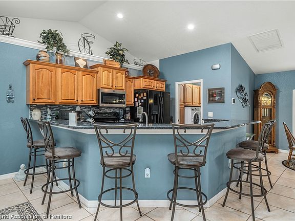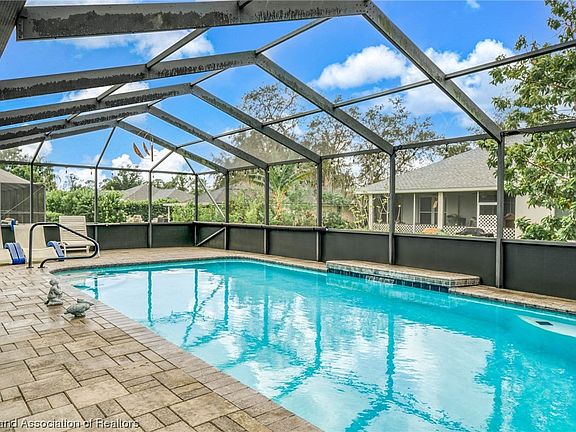 custom painted circle driveway, skeeter beater screen on garage door, and a water fountain to top it off. Built in 2004, the interior has plenty of space with 2,052 living square feet and plenty of lighting with a large sliding glass doors going out to the patio and pool space, tall ceiling and skylights. Tile floors throughout the home, custom shutters and ceiling fans in every room. The large and open kitchen has granite countertops, stainless steel and black appliances and long bar for entertaining. Laundry room off the kitchen with storage cabinets. Master suite has lots of space, with tile floors, a skylight for the best lighting and two walk in closets. Master bathroom has his and her vanities, tiled shower and a jetted tub. This home is a split floor plan so guest rooms are on the other side of the house. They feature tile floors, ceiling fans and custom shutters. Guest bathroom has granite countertops, tile floors and tiled shower with glass door. The outdoor space is ready to take entertaining outside featuring a caged in solar heated salt water pool and covered patio plus a 14' x 14' BBQ area. Even has two skeeter beaters to be able to close off the patio area. Three car garage has great storage and painted floors. As you can see this home has it all! Set up your showing you will be impressed.