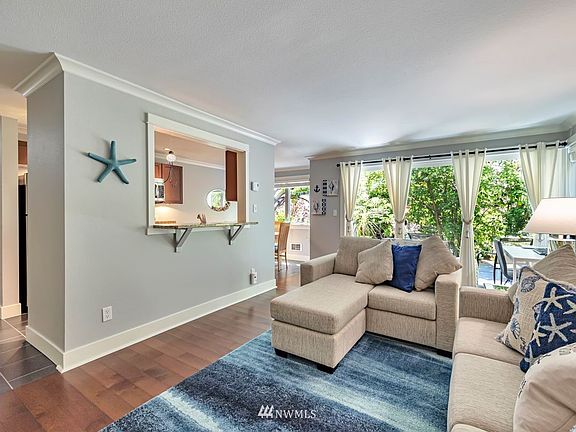Light & bright, private, peaceful, open and inviting updated ground floor 2 bed/1.75 bath condo in the heart of Ballard. Rich hardwood flooring and designer colors. Open kitchen with slab granite counters, cherry cabinetry, pantry, storage and stainless appliances. Dining and generous sized living room with slider to the large private patio and garden area for relaxation and entertaining. Primary suite with bath. Second bedroom and full bath, in-unit full size washer & dryer. Reserved parking space. Secure lobby entry. 94 walk score! A few short blocks away from all your favorite Ballard spots! Sunday Market, dining, breweries, Locks, parks & shops. Well managed building with many recent updates. *$5,000 closing cost bonus.