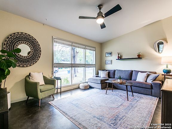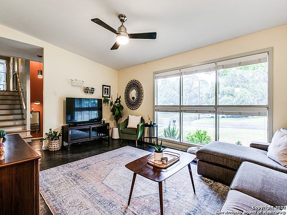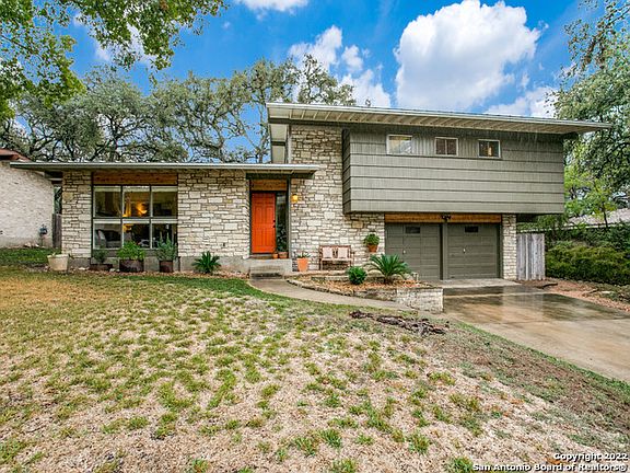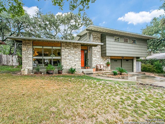 Take a look at this amazing split-level home, centrally located in the popular neighborhood of Forest Oaks, just off 410 and Nacogdoches. The mid-century modern home features an open, flowing floorplan, 3 large bedrooms, 2 bathrooms, an office, laundry room and a balcony overlooking the beautiful backyard off the master bedroom. The updated, open kitchen with granite countertops makes the home great for entertaining. Large windows throughout the home offer plenty of natural light showing off the concrete, wood and tile flooring. The covered patio leads you into the large backyard with a treehouse. The metal roof was replaced in 2017.